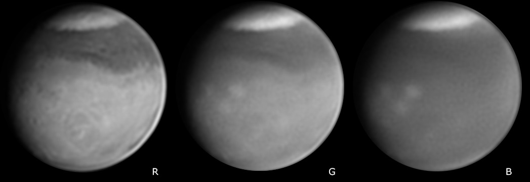 | 岩政隆一氏による2018年6月1日の火星。左から赤(R)、緑(G)、青(B)の画像。波長によってこんなに違います。 |