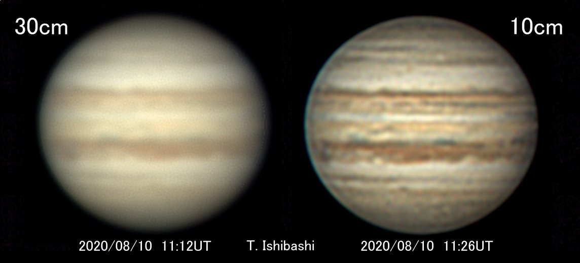 | 逆に見えるかもしれませんが、左が30cm反射、右が10cm反射による同日の木星画像です。悪シーイングの時は、小口径の方が良い画像が得られるという一例です。 |