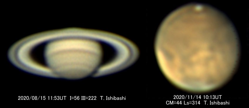 | 左) 土星は主な縞模様やカシニの空隙が写ります。環の上に土星の南極地方がわずかにのぞいているのもわかります。右) 11月14日の火星で、中央の明るいところが発生間もないダストストーム。南極冠や北極の淡く広がった雲も捉えることができる。 |