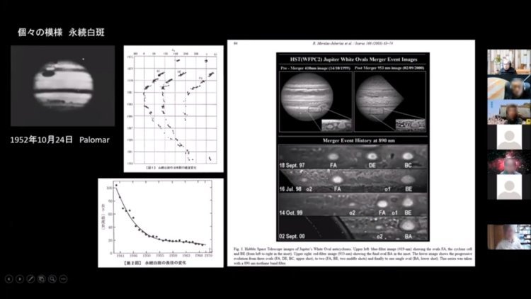会議は午前10時に始まり、月惑星研究会会長の田部一志氏による「木星の気象解明史(カッシーニ(17世紀)からJunoまで)」、JAXA宇宙科学研究所(ISAS)の佐藤毅彦教授による「木星型惑星、21世紀の描像:近年の成果の紹介」という2件の講演が行われました。 探査機Junoによる最新の知見に基づいた解説は、大変興味深いものでした。 午後は木星会議恒例の筆者による最近1年間の木星面のまとめと研究発表4件があり、夜はオンラインでの懇親会も開かれました。