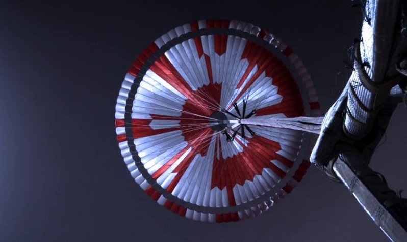 冒頭は統制室の様子が写しだされ緊張感が漂ってきます。 画面が降下中の探査機に切り替わると間もなくパラシュートが開きました(図1)。 パラシュートは白地に赤で小さな扇の模様が描かれていました。