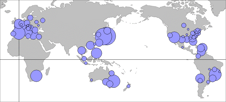 | 過去5年間の報告を観測地の国や地域別にプロットした。円の大きさは報告数を示す。火星についても同じような分布になっていると考えられる。 |