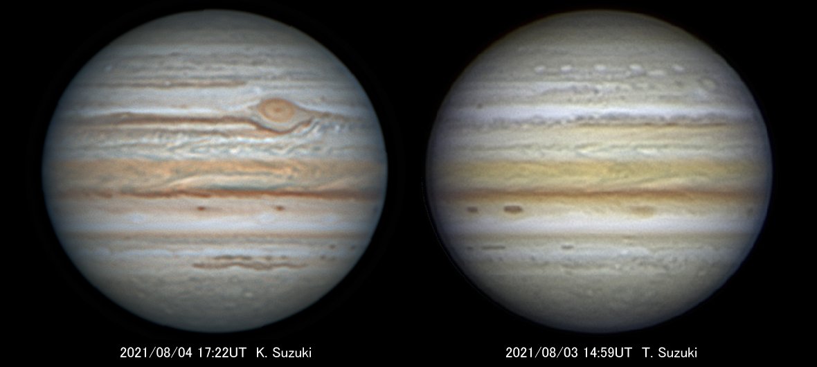 | 30cmによる画像と比較してもまったく引けを取らないすばらしい木星画像です。観測者の努力と熱意が伝わってきます。撮像:左) 鈴木邦彦氏(神奈川県、19cm)、右) 鈴木隆氏(東京都、18cm) |