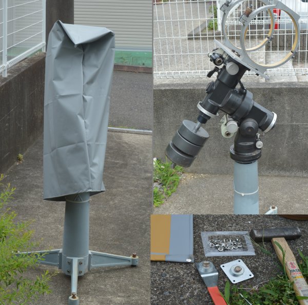 そのままではただのシートなので、カバーに仕立てます。 ロープ穴は切り取って必要な面積にし(経済的に2回分の2分割にしています)、裏面を天頂側で折って両サイド辺を両面テープ接合してから、一回折って両面テープで重ねた後、カシメ金具で固定して最後に裏返せば完成です。 費用は防水シート、両面テープ、カシメ金具代で6千円程度(2回分)、これで数年維持できれば安い投資です。 おかげで赤道儀は今も元気に動いています。