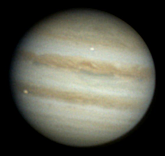 | 23時57〜58分頃に発生。コロンビア(南米)のアンドレス・アルボレダ氏撮影。画像は北が上。中央上の白い点が閃光。左下の白点は経過中のイオ。 |
