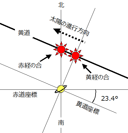| 今年の土星は黄道よりも南側にあるので、黄経の合→赤経の合の順となる。 |