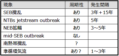 取り上げた6つの現象を見ると、表のように周期性のあるものないもの様々です。 大雑把に見ると、発生間隔は3年か5年の倍数というパターンが多いようです。 準循環気流を除くと、同じ規模の現象が再発するにはある程度の時間が必要なようです。 SEB攪乱は前回から3年以内に発生すると活動が弱い傾向があり、木星大気がエネルギーを蓄えるのに最低3年かかると見ることができそうです。