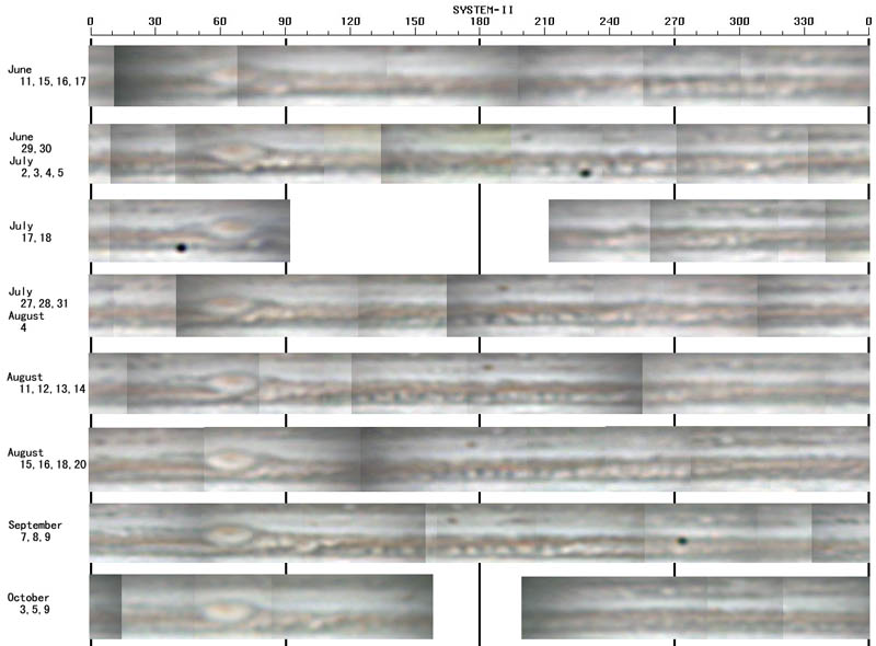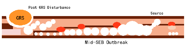 When the preceding white spots reached at L2=100 deg. in early August, they disappeared as the white spots got into the SEBn. This feature was maintained at the preceding until the end of apparition. The source of outbreak moved slowly forward, but the activity of outbreak source became weaker in September. Therefore the white spots, which were located at the following end, disappeared within the region of 50 deg. until the end of September. The longitude of the preceding end maintained at about L2=100-130 since October. On the other side, because the following end of outbreak moved slowly forward, it became shorten to the 40 deg. length in December.