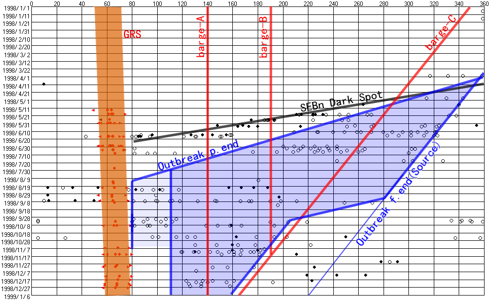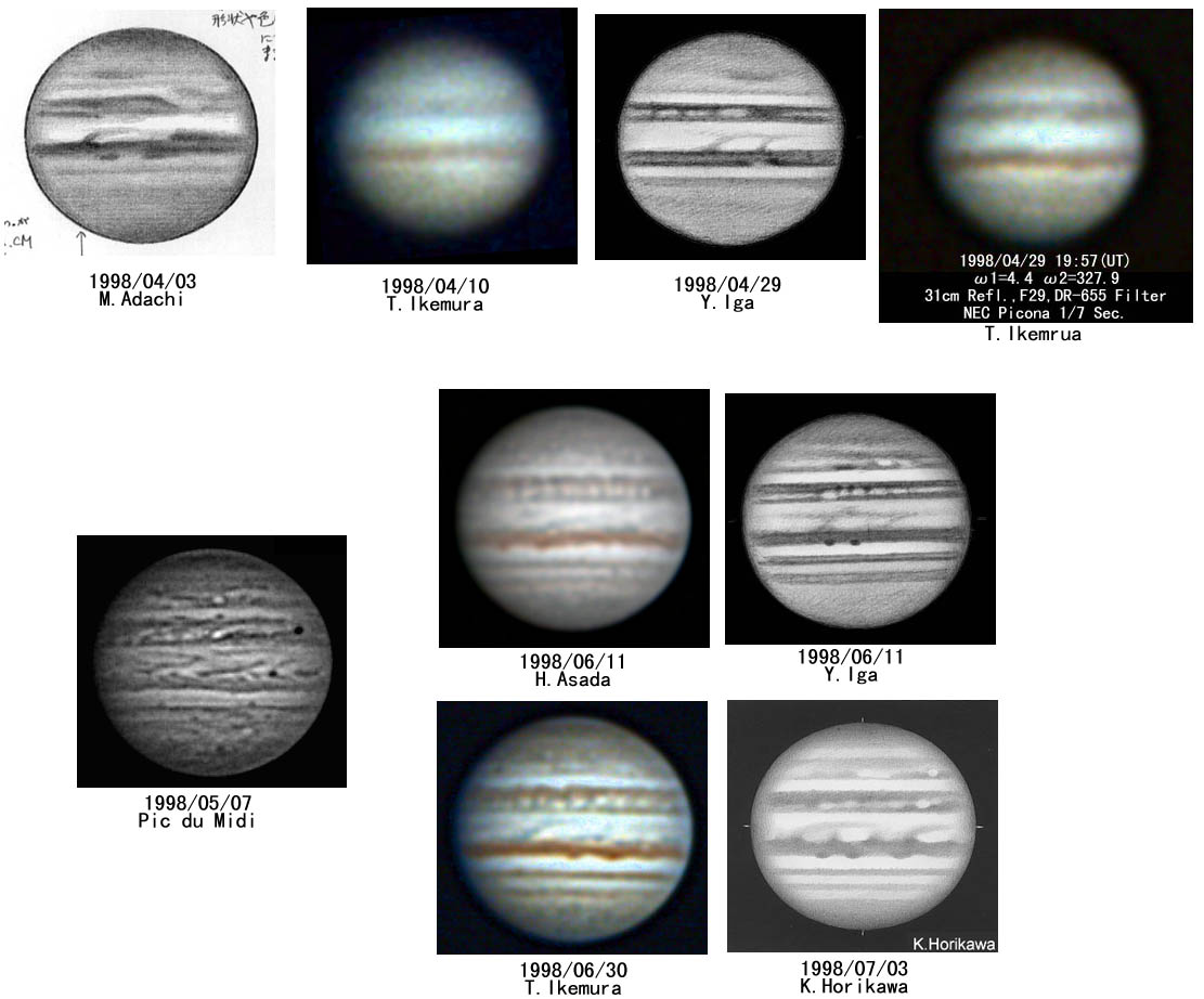 The most interesting phenomenon was the mid-SEB outbreak in the apparition of 1998. Miyazaki found a group of white spots of SEBZ located at 315-345 degrees of system-II (L2) in March 31, 1998. This source of outbreak moved slowly forward at the rotation period of 9h55m18.8s. A lot of white spots, which were supplied from the source, expanded rapidly forward the SEBZ, and the preceding end reached at L2=100 in early August. Many white spots of outbreak filled up the region of 190 deg. of the longitude in SEBZ. This preceding end had the rotation period of 9h54m21.4s.