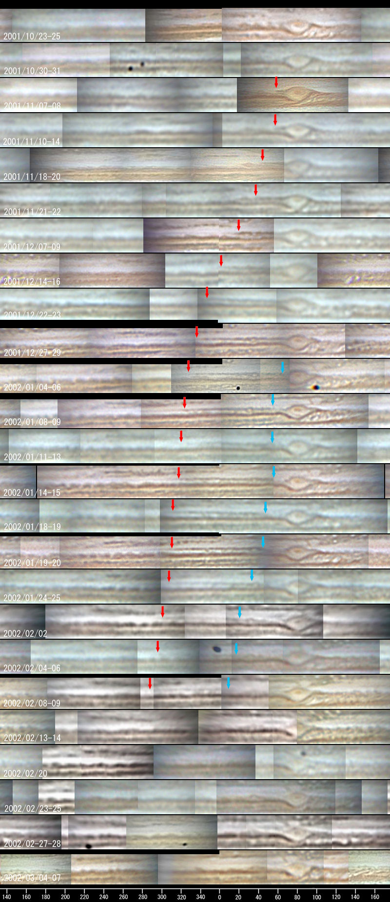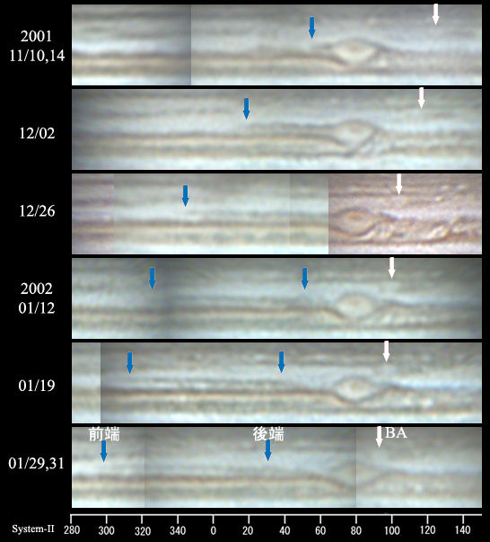 南熱帯のダーク・ストリーク2001年11月7日UTにGRSの前方に発生したSTrZ(南熱帯)のdark streakは、急速に前方に伸びています。12月2日UTには長さが50°、12月26日UTには90°に達し、りっぱなSTrZ bandに成長しました。発生以降のドリフトは-41.3°/月ですが、海外からの高解像度の画像を見ると、STrZ bandはさらに前方に細く伸びていて、第II系で240°付近まで達しています。 ところが、2002年1月8日UTにこのdark streakの後端部がGRSから離れていることに気がつきました。GRSの南側を取り囲む暗いアーチ構造が淡くなっていることから、streakへの供給がなくなったと考えられます。streakの後端部も同じ速度で前進しており、これまでの観測を裏付けるようにstreakは長さは90〜100°までしか成長できないようです。また、後方からの供給が途絶えたstreakは、全体が急速に淡化しつつあります。 | ||||||
