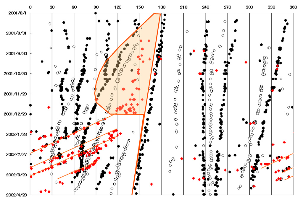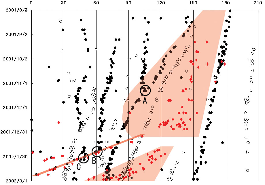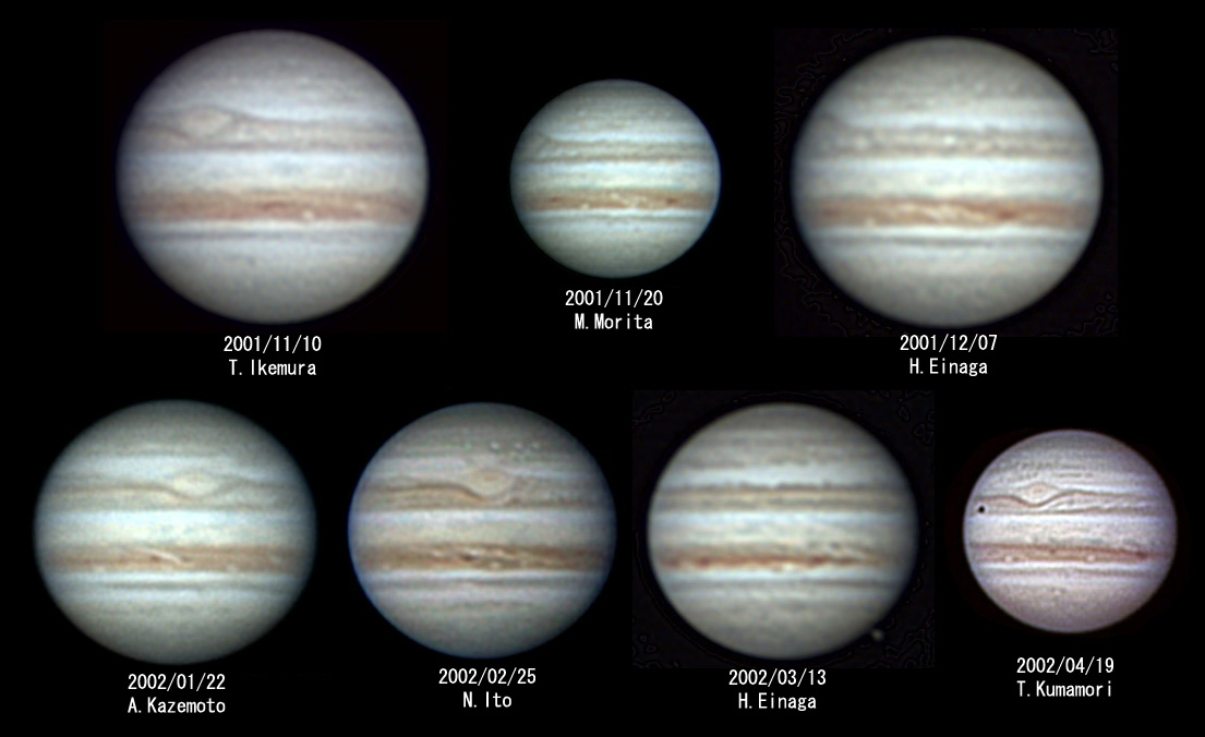 2001-02年のNEBの活動2001-02年のNEB(北赤道縞)は、前シーズンから始まったNTrZへのベルトの幅の拡張が全周に渡り、NEBの拡幅期をむかえた。前回のNEB拡幅は1996年で、5年ぶりである。拡幅によってNEBの中央にbargeが見られ、それらをつなぐようにNEB中央にベルトが出現した。NEB北縁には湾入した白斑notchが多く見られた。 2001年8月-12月(第1期)には、ω2=150°付近で連続的に白斑が発生し、NEBを南北に横断する巨大なriftを形成した。2002年1月-3月(第2期)には、ω2=110°付近のNEBnに白斑が4回連続的に発生し、riftを形成しつつ高速に前進して全周を覆いつくした。2002年4月以降(第3期)には、NEB北部が部分的に明化を始め、NEBの衰退期をむかえつつあった。NEB南部もriftによって全周が明るくなり、本来のNEBnだけが中央部にベルトとして残っていた。 | ||||