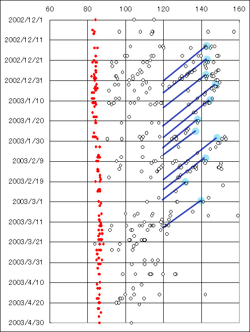 2002-03年 mid-SEB outbreak2002年12月中旬にmid-SEB outbreak(南赤道縞中央の白斑突発現象)がII=143°で発生しました。発生源に生まれた輝く白斑はSEB内を急速に前進します。また、発生源では連続して白斑が供給されます。今回の発生源はGRS(大赤斑)のすぐ後方にあり、定常的な擾乱領域と活動が区切られている必要があります。 最初のoutbreak発生から、12月に2次の白斑が発生し、さらに1月に3回の発生が見られました。2月にも明るくはありませんが、発生源から白斑の発生があったようですが、次第に擾乱領域の活動と区別が難しくなってきました。3月には急速に活動が衰え、太いSEBnが大赤斑後方まで前進しました。 今回のmid-SEB outbreakの発生源は、大赤斑の後方59度と、過去のoutbreakの大赤斑との経度差は最も小さなものでした。そこで、近年の大赤斑後方の白斑活動を見直し、post-GRS disturbanceと区切られた白斑活動を見つけました。私は、2001年1月と2001年12月に見られた白斑活動も、mid-SEB outbreakだったと考えています。 | ||||||||