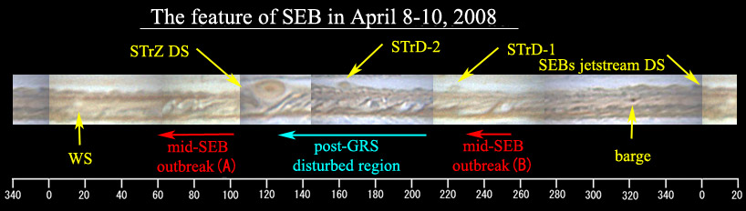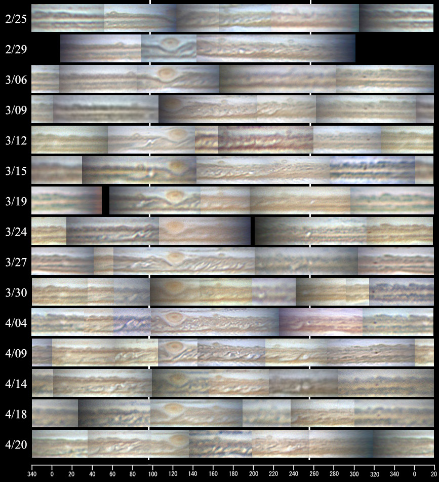 同時に2個のmid-SEB outbreakが発生mid-SEB outbreakはSEB内白斑突発現象であり、SEB(南赤道縞)南部に発生した明るい白斑が、シアーされた帯状流によって東西方向に引き伸ばされて、SEBを前進し続けて、SEBを白斑で埋めつくしていく現象である。 今回のmid-SEB outbreakは、3月13日の発生が観測された11日後には、別な場所にも同時に発生する様子が観測された。 それぞれのmid-SEB outbreakでは、ゆっくりと前進する発生源から7〜10日間隔で明るい白斑が出現している。発生した白斑はシアーされた帯状流によって東西方向に引き伸ばされて、前方に拡がっていく。 mid-SEB outbreakは、2000年以降は毎シーズンのように観測されているが、大赤斑の後方100度以内に発生していて、あまり活発なものではなかった。今回のように、大赤斑の前方に発生したoutbreakは1998年以来のことで、今シーズンは活発なoutbreakの活動が見られるかもしれない。 その他のSEBの状況南熱帯の暗斑が大赤斑に飲み込まれる大赤斑直前のSTrZの暗斑は、 SEBs南縁のドーナツ状暗斑として、 2月25日に II=65.6度に、3月1日にII=71.6度に見つかった。このSTrZの暗斑はかなり高速で後退し、4月9日にII=109.9度の大赤斑の直前まで達し、その後大赤斑に飲み込まれたようだ。 南熱帯攪乱STrD-1、STrD-22月24日のII=242.2度と、2月26日のII=176.3度の南熱帯に暗斑が見つかった。阿久津富夫氏の観測から、この暗斑は近赤外画像でドーナツ状であり、メタン画像で明るい。可視光ではオレンジ色のドーナツ状で、高気圧性白斑(anticyclonic oval)である。 2個の暗斑は、それぞれ昨シーズン発生した南熱帯攪乱STrD-1、STrD-2から形成されたようだ。 STrD-2はドリフトがBAよりやや遅いために、近いうちにBAに追い越されるかもしれない。7月下旬ごろには大赤斑の後方に到達する。 | ||