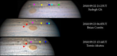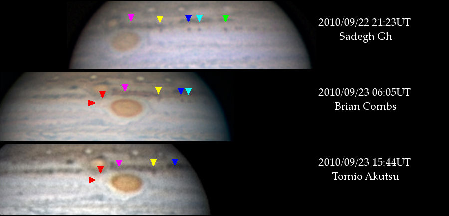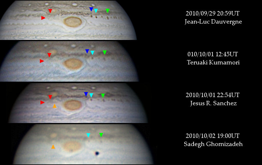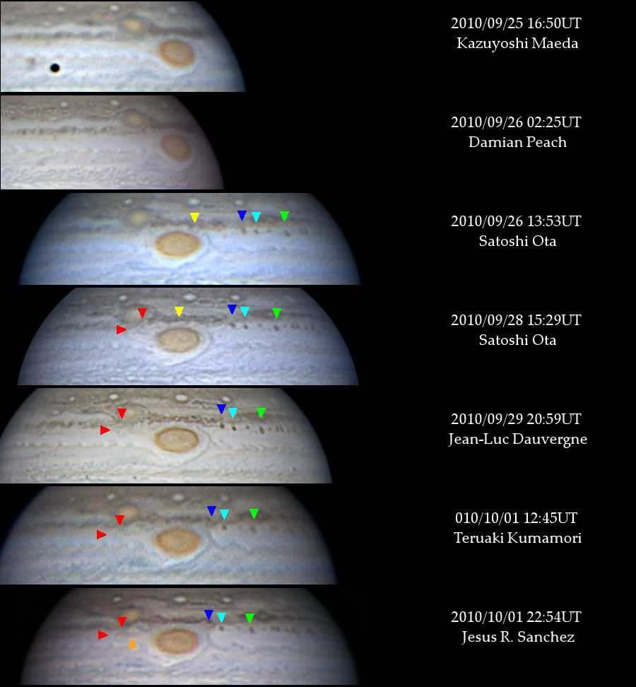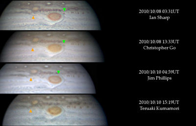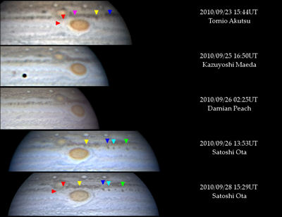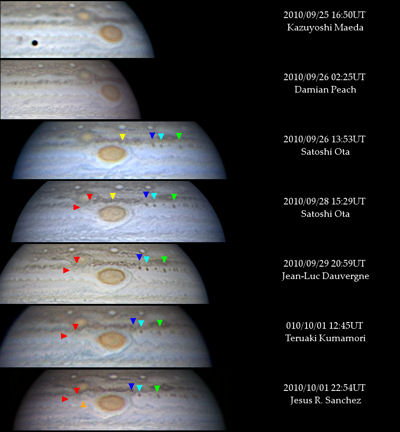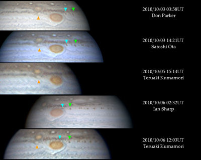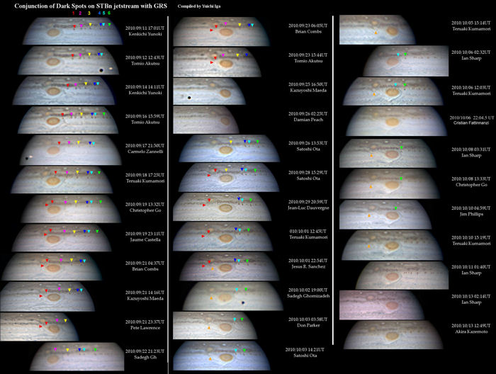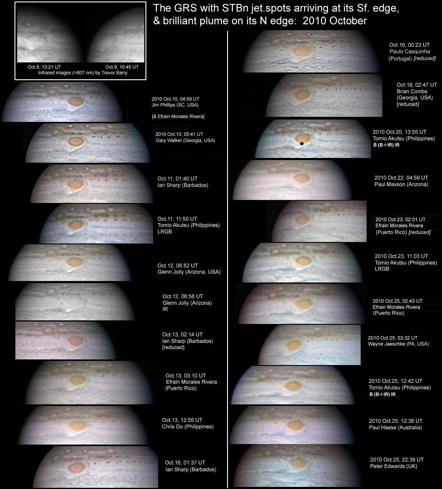 Although all but the first spot disappeared alongside the GRS, traces of them did emerge as a growing stack of oblique bright and dark streaks Sp. the GRS - especially well shown in the v-hi-res images on Sep.28 (S. Ota) and Oct.3 (G. Walker) and Oct.8 (I. Sharp, T.Barry in IR). At least one of these has again rounded up to form another prograding bright spot on STBn alongside oval BA (Oct.1-8). So, the dark spots have all been disrupted, but traces of them survive and can reassemble into vortices after the passage.