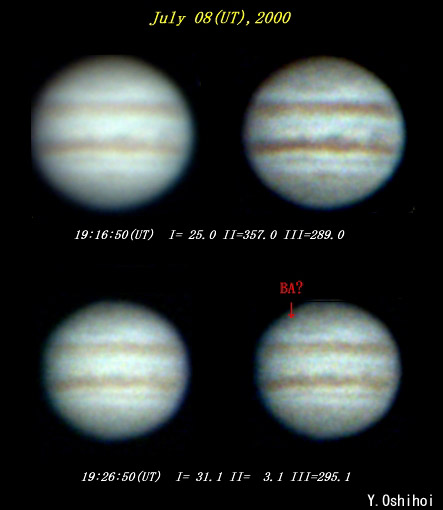 No. 5 2000/07/08 19:42:46(UT) I= 40.8 II= 12.7 III=304.7 1/8sec, 8 frames composite, Seeing:3/10 Transp.:2/6 No. 6 2000/07/08 19:46:57(UT) I= 43.3 II= 15.2 III=307.2 1/8sec, 7 frames composite, Seeing:3/10 Transp.:2/6 No. 7 2000/07/08 19:52:32(UT) I= 46.7 II= 18.6 III=310.6 1/8sec, 9 frames composite, Seeing:3/10 Transp.:2/6 No. 8 2000/07/08 20:02:36(UT) I= 52.9 II= 24.7 III=316.7 1/8sec, 7 frames composite, Seeing:3/10 Transp.:2/6 | ||