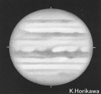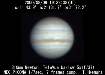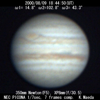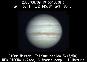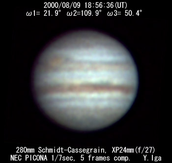 | No.22 2000/08/09 19h33m(UT)ω1= 44.8 ω2=132.4シーイング=5-6/10 透明度=2-4/5 16cm反射 200倍