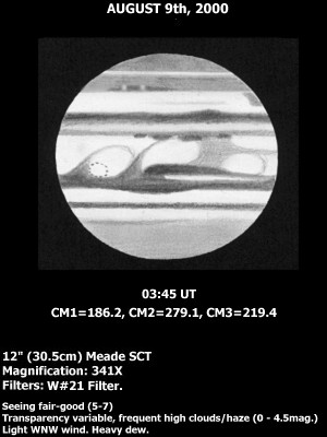![]() No. 29 2000/08/09 19:32:38(UT) I= 43.9 II=131.7 III= 72.2 De= +3.3 E.Dia=37.44" |