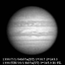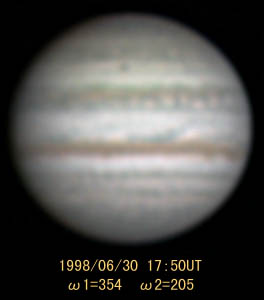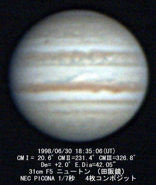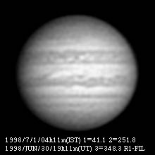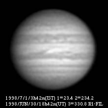 ![]() No.20 1998/06/30 17:30(UT) I=341.2 II=192.4 Seeing:3-4/10 Transp.:2-1/5 x311 |