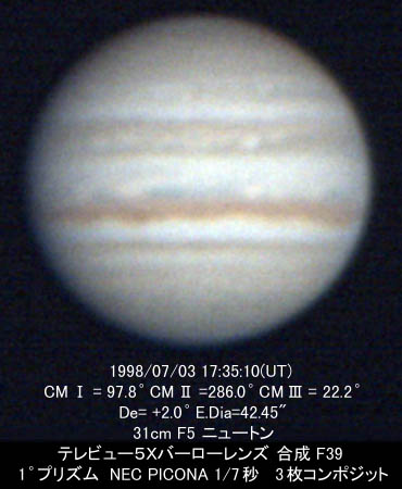 ![]() No.24 1998/07/03 18:03(UT) I=115.1 II=303.2 Seeing:4-5/10 Transp.:2/5 x311 |