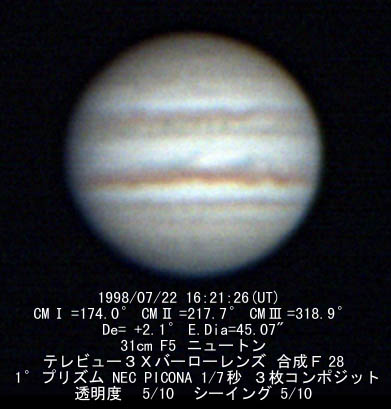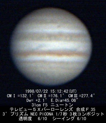 ![]() No.34 1998/07/22 17:52(UT) I=229.7 II=272.7 Seeing:3/10 Transp.:5/5 x360 |