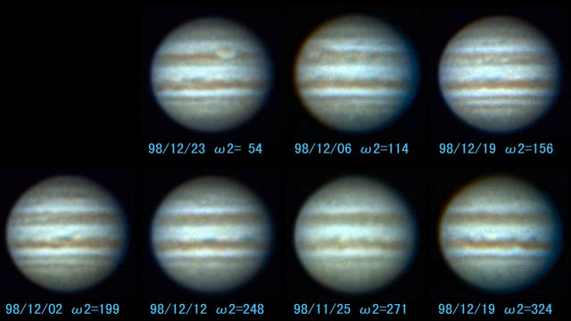 11月下旬から12月中旬までの池村氏・前田氏のPICONA画像から、木星の全周をほぼ45度に分割した7枚から構成しました。