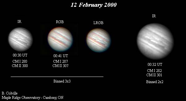 February 12 was clear, but there was a fair wind. Seeing was only moderate, maybe 5/10. The best images were obtained with 3x3 binning to keep exposures short through the coloured filters. I managed to get a few images with 2x2 binning in the IR. I have attached the best set of IR, RGB, and LRGB images.