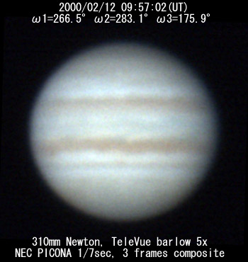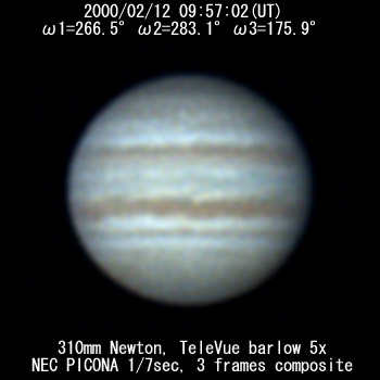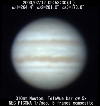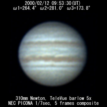 The most prominent feature that I see is the prominent Equatorial Belt, rather irregular, and a bridge of material streaming from the NEB into the EB just preceeding the CM. It (EB) appears to me to be becoming much more prominent. Does anyone have any other comments on this?