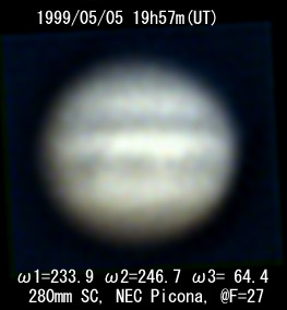 ![]() No. 3 1999/05/05 19h57m(UT) I=233.9 II=246.7 III= 64.4 280mm Schmidt-Cassegrain, Or25mm, @F=27 NEC Picona 1/7sec, 6 images composite Seeing:2/10 Transp.:5/5 |