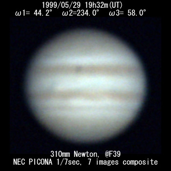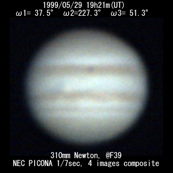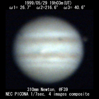 ![]() No. 2 1999/05/29 19:21:06(UT) I= 37.5 II=227.3 III= 51.3 310mm Newton(F5) TeleVue barow 5x @F=39 6 deg. prism, NEC PICONA 1/7sec 4 images median | |