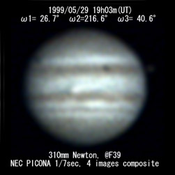 ![]() No. 1 1999/05/29 19:03:24(UT) I= 26.7 II=216.6 III= 40.6 310mm Newton(F5) TeleVue barow 5x @F=39 6 deg. prism, NEC PICONA 1/7sec 4 images median | |
