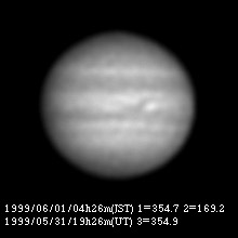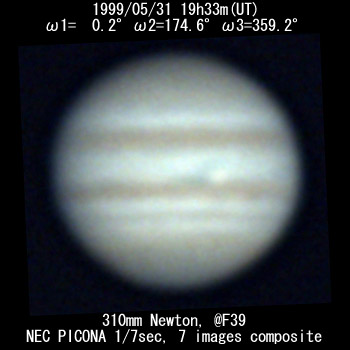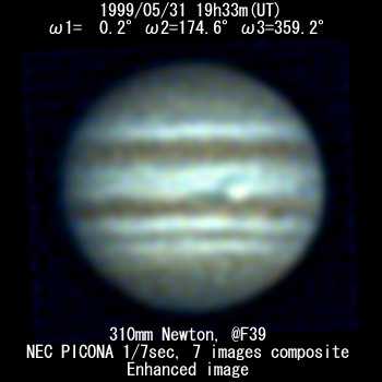 ![]() No. 1 1999/05/31 19h20m(UT) I=352.4 II=167.0 III=351.6 280mm Newton NEC PICONA 1/7sec | ![]() 強調画像作成:伊賀 | |