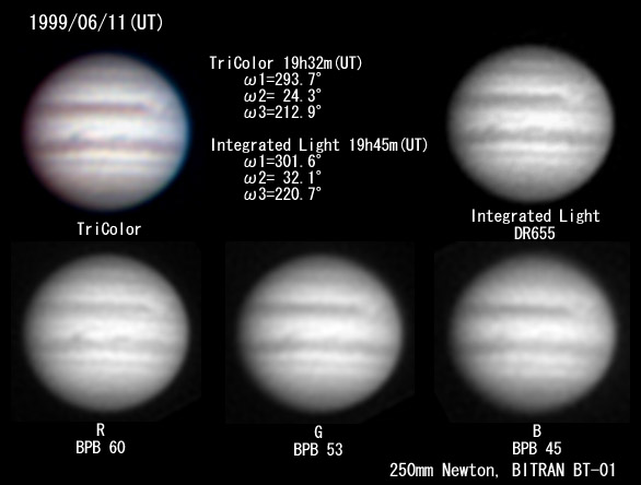 大赤斑の前方のSTBは1本のベルトとして捉えられました。昨シーズンに非常に顕著な姿を見せていたSTBsの暗斑は、そのドリフトからII=0度付近に予想されますが、合をはさんで大赤斑の南を通過したことによって消失したようです。一方、その後方30度ほどに存在していたSTBs Dark Streakは、ちょうど大赤斑を通過し終えている姿が捉えられています。池村氏の画像では、II=53度付近に経度長11度ほどに見えており、この後方は6月9日の観測で詳細に捉えられていて、STBs暗斑(#3)がII=73度でまさに大赤斑の南を通過しようとしています。これらの2日間の観測から、昨シーズンに見られていたSTBsの暗斑(#1)は消失し、暗斑(#2)がその経度方向に伸びた状態で大赤斑の南を通過していて、またその後方の暗斑(#3)も大赤斑の直後を通過しようとしていることが判明しました。