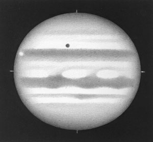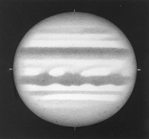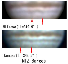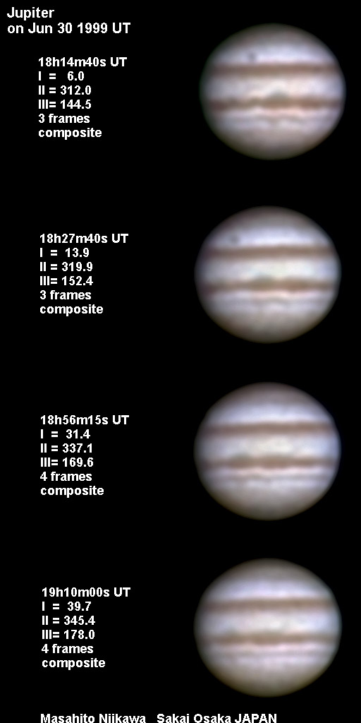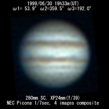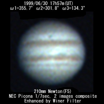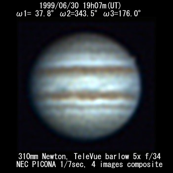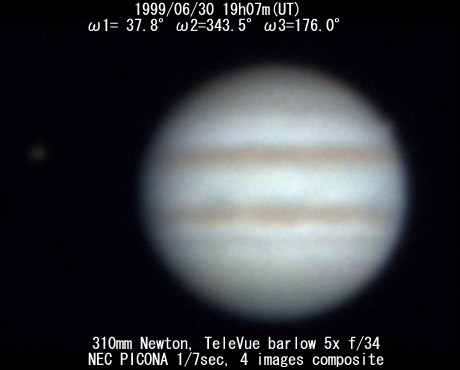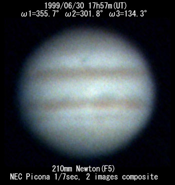 ![]() No. 4 1999/06/31 17h57m(UT) I=355.7 II=301.8 III=134.3 210mm Newton(F5) NEC Picona 1/7sec 2 images composite |