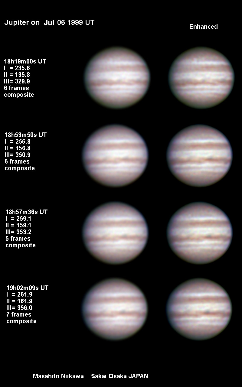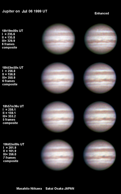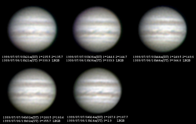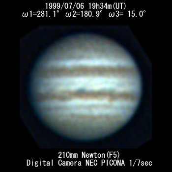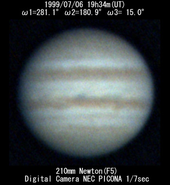 ![]() No. 6 1999/07/06 19:33:36-19:33:48(UT) I=281.1 II=180.9 III= 15.0 210mm Newton(F5) NEC Picona 1/7sec |