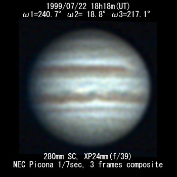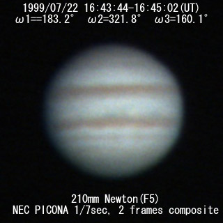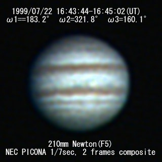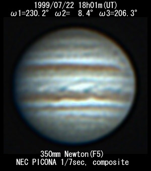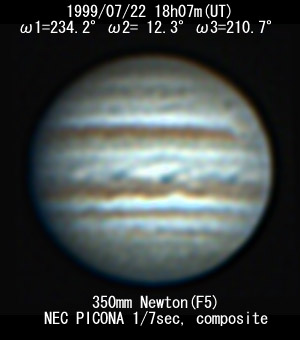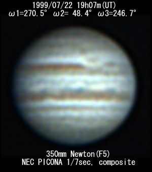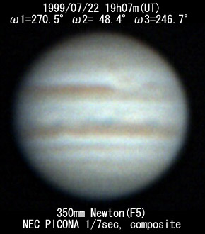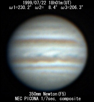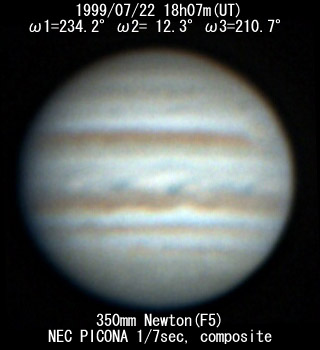 ![]() No. 15 1999/07/22 18h01m(UT) I=230.2 II= 8.4 III=206.3 350mm Newton(F5) NEC PICONA 1/7sec | ![]() 強調画像作成:伊賀 | |