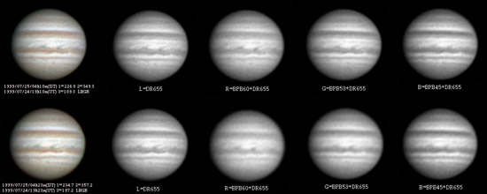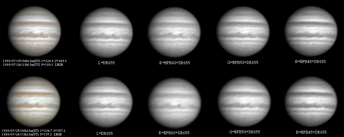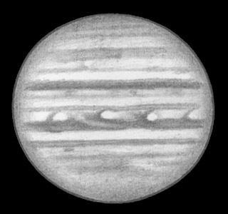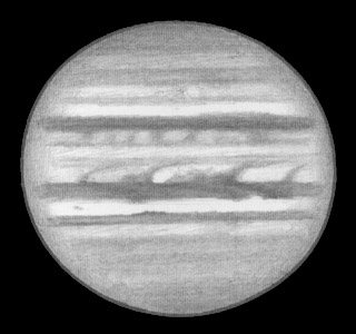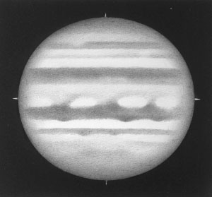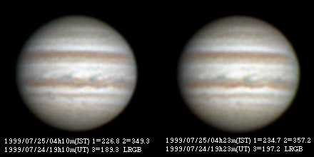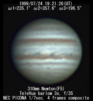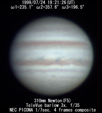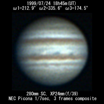 ![]() No. 7 1999/07/24 18h34m(UT) I=206.8 II=329.6 III=168.5 600mm Cassegrain, x600 Seeing:3/10 Transp.:5/5 |