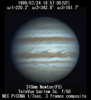 ![]() No. 31 1999/07/24 18:57:00(UT) I=220.2 II=342.8 III=181.7 De= +3.3 E.Dia=40.33" |