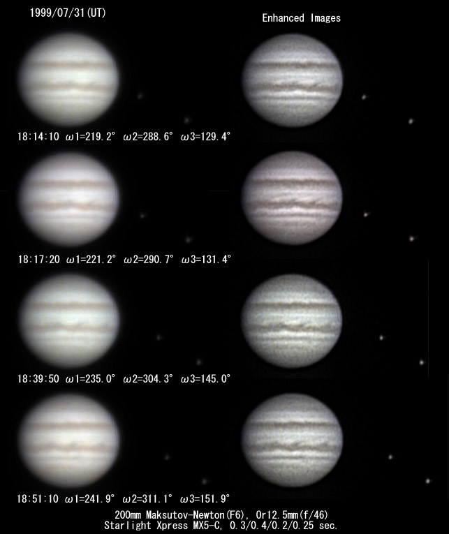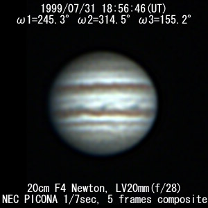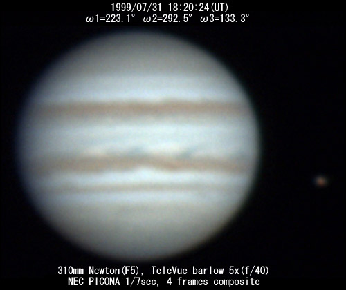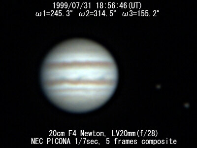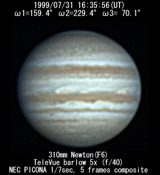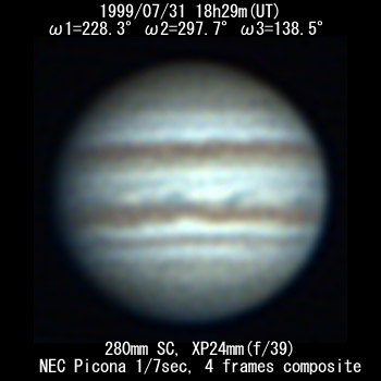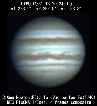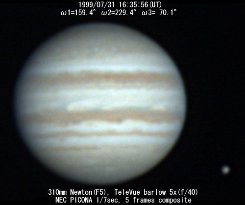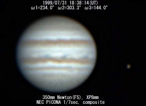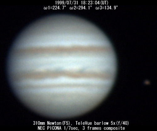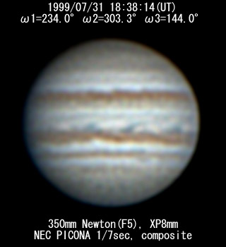 ![]() No. 20 1999/07/31 18h38m(UT) I=234.0 II=303.0 III=144.0 350mm Newton(F5) NEC PICONA 1/7sec | ![]() 強調画像作成:伊賀 | |