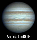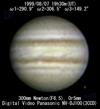 ![]() No. 9 1999/08/07 19h30m(UT) I=290.9 II=306.5 III=149.2 12 frames composite | ![]() 300mm Newton(F6.5) Digital Video camera Panasonic NV-DJ100 3CCD