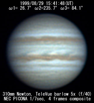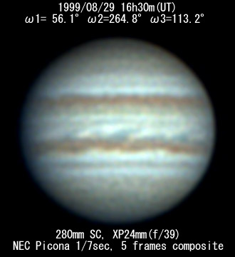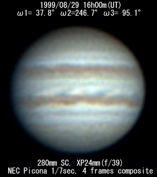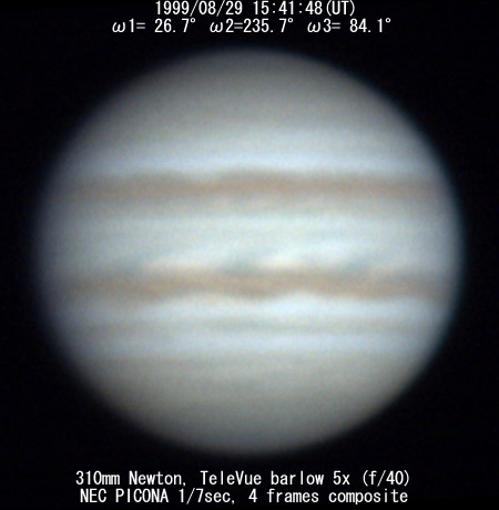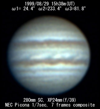 I= 37.8 II=246.7 III= 95.1 280mm Schmidt-Cassegrain, XP24mm(f/39) NEC Picona 1/7sec, 4 frames composite Seeing:7/10 Transp.:4/5