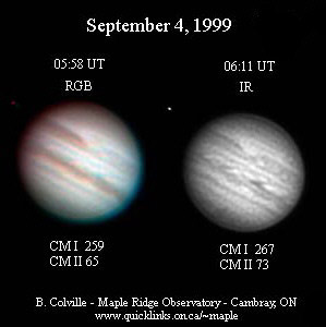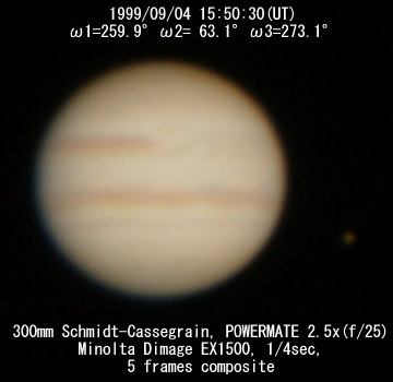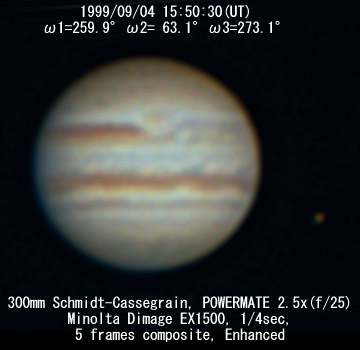 ![]() No. 45 1999/09/04 18:42:02(UT) I= 4.5 II=166.8 III= 16.8 350mm Newton(F5) NEC PICONA 1/7sec 3 frames composite | ![]() 強調画像作成:伊賀 | |
