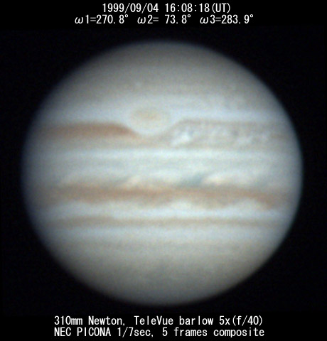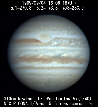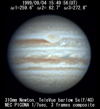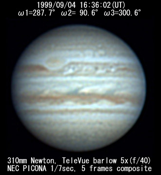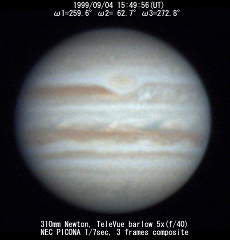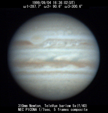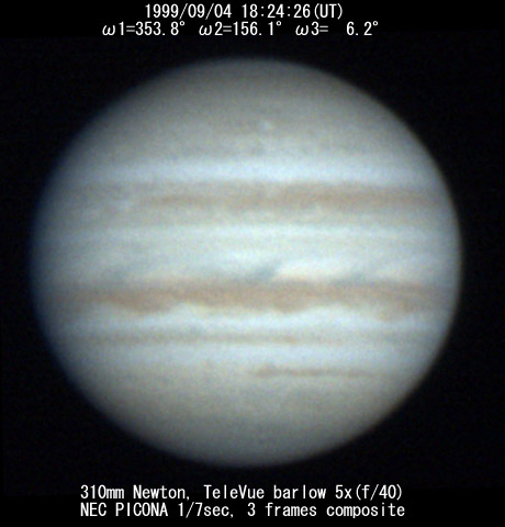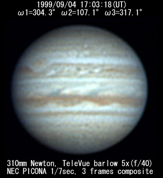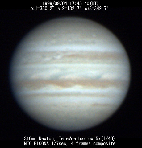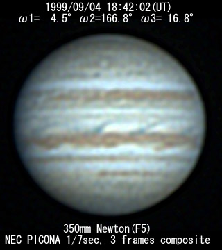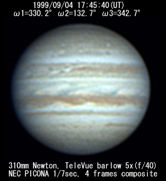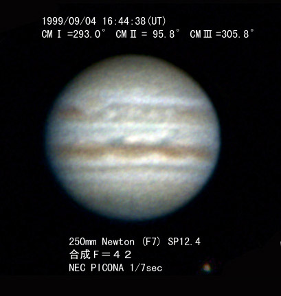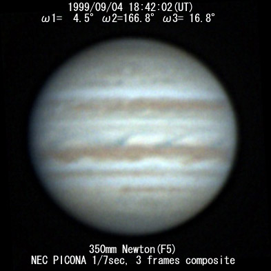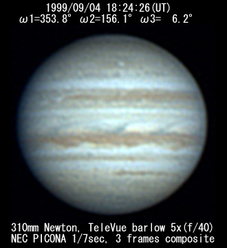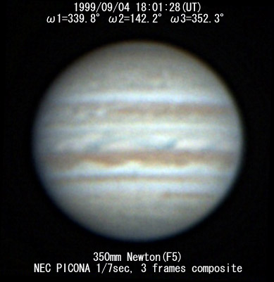 ![]() No. 44 1999/09/04 18:01:28(UT) I=339.8 II=142.2 III=352.3 350mm Newton(F5) NEC PICONA 1/7sec 3 frames composite | ![]() 強調画像作成:伊賀 | |