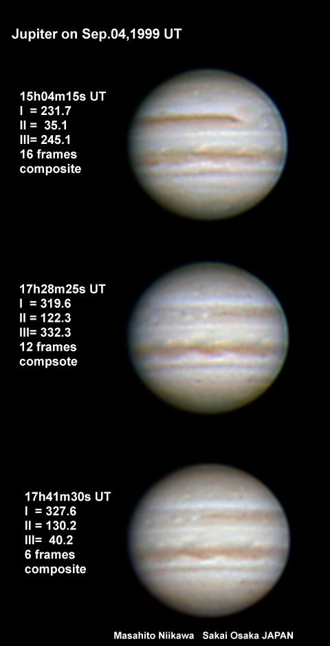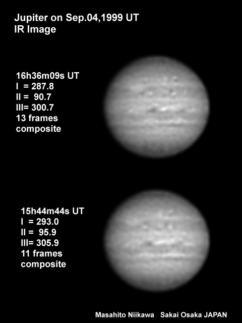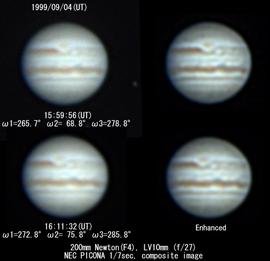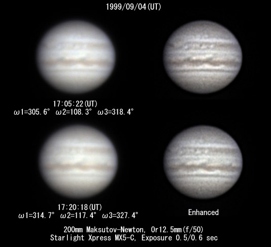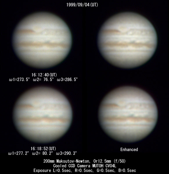 1999/09/04 17h28m25s(UT) I=319.6 II=122.3 III=332.3 12 frames composite 1999/09/04 17h41m30s(UT) I=327.6 II=130.2 III= 40.2 6 frames composite Telescope : C11 (SC) D=280mm fl=2800mm Camera :Minolta DimageEx1500 Digital Camera taking lens removed Effective F No.: 25 (XP24mm Eyepiece Projection) Filter: IR cut & Low-pass built-in the camera Obs.site : Mozuhonmachi Sakai-City Osaka Japan Exposure : 1/4 sec or 1/8 sec Analog gain:6dB Seeing:8/10 Transp.:1/6 Image Processing The Maximum Entropy Method deconvolution after composite of the original taking images. And enhanced with the unsharp masking method. | ||