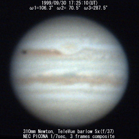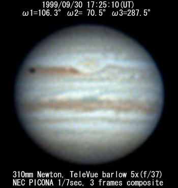 ![]() No.101 1999/09/30 17:32:34(UT) I=110.8 II= 75.0 III=292.0 De= +3.6 E.Dia=48.80" |