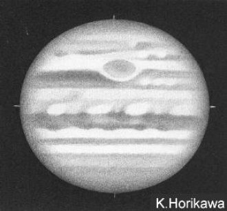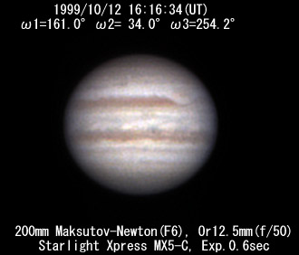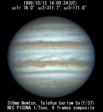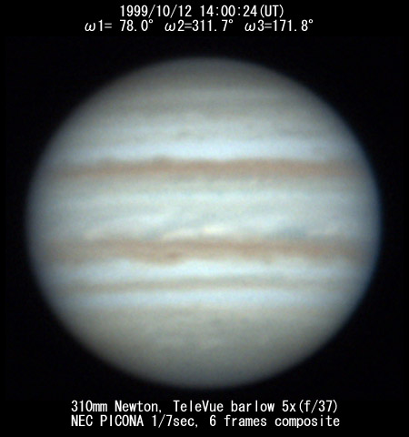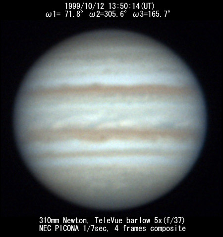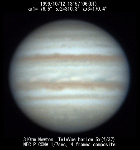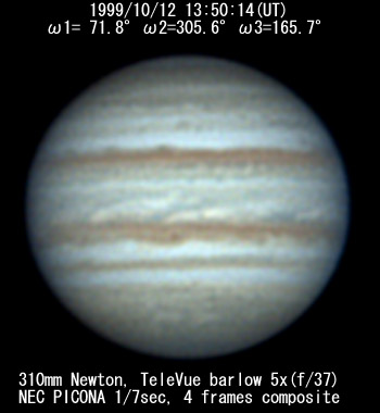 ![]() No.115 1999/10/11 13:50:14(UT) I= 71.8 II=305.6 III=165.7 De= +3.5 E.Dia=49.49" |