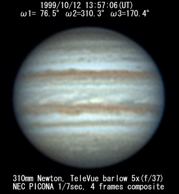 ![]() No.116 1999/10/11 13:58:00(UT) I= 76.5 II=310.3 III=170.4 De= +3.5 E.Dia=49.49" |