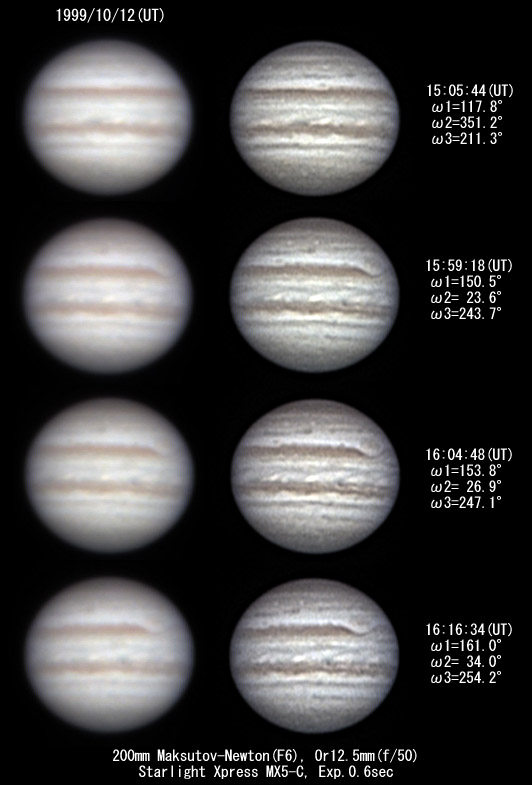 ![]() No.30 1999/10/12 15:05:44(UT) I=117.8 II=351.2 III=211.3 No.31 1999/10/12 15:59:18(UT) I=150.5 II= 23.6 III=243.7 No.32 1999/10/12 16:04:48(UT) I=153.8 II= 26.9 III=247.1 No.33 1999/10/12 15:43:02(UT) I=161.0 II= 34.0 III=254.2 Enhanced by H.Nakanishi
