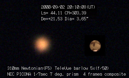 2000/09/02 20:10:08(UT) Ls= 44.11 CM=303.39 De=+21.53 Dia= 3.65" 310mm Newtonian(F5) TeleVue barlow 5x(f/50) NEC PICONA 1/7sec 7 deg. prism 4 frames composite