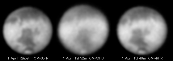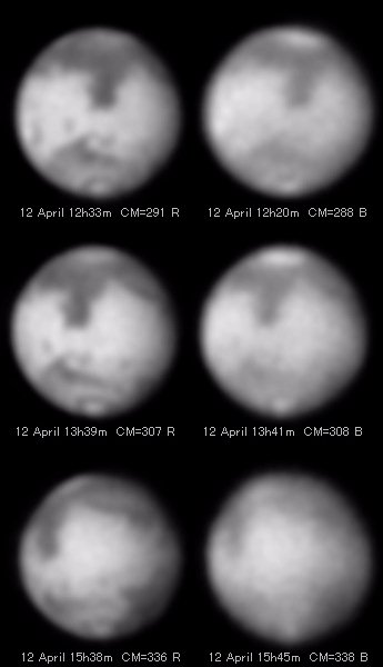 - 北極冠は眼視で小さく見えている。朝霧は丁度大シュルチスの位置にあたるが、青味を感じる。一方、夕霧はアマゾニス付近で小さく見える。(B光画像のエリュシウム西方の明部)