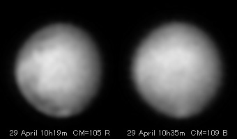 - 幾分遠のき、小さくなったのが眼視でわかる。DEの変化か、南極冠の拡張か判らぬが、ヘラスが北極冠より明るく感じられる。R光では同等の明るさである。